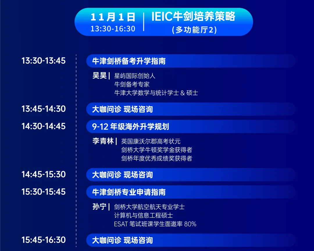 英国牛津、剑桥等TOP学府依然是无数学子心中的学术高地。本论坛以“牛剑G5英本顶 尖申请策略”为主题,汇聚前牛剑录取者及国际竞赛与科创规划专家,系统解析从学科深耕、竞赛突破到科创实践的全链路培养路径。为志在冲击牛剑及英国G5超级精英大学的学生与家长,提供学术规划与申请指导。