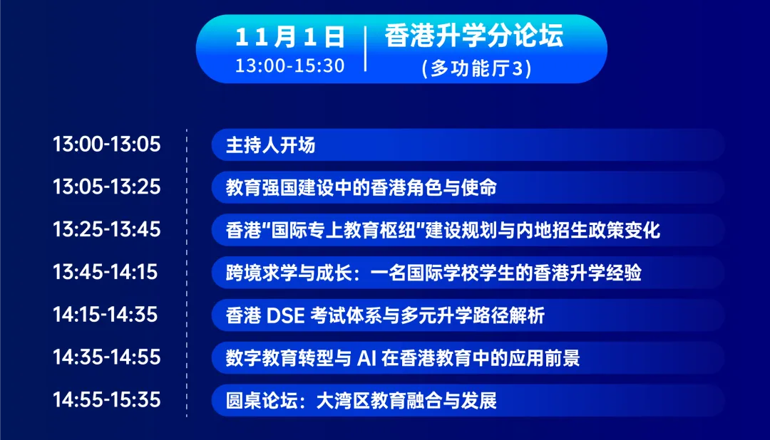 伴随大湾区教育融合发展,香港凭借其国际化的学术环境与地缘优势,成为升学新高地。本论坛全面剖析香港高校的招生政策、升学优势与就业方向,探讨香港学历赋予学生的全球发展机会,助力家庭把握机遇,为子女规划一条立足大湾区、面向未来的成长通道。