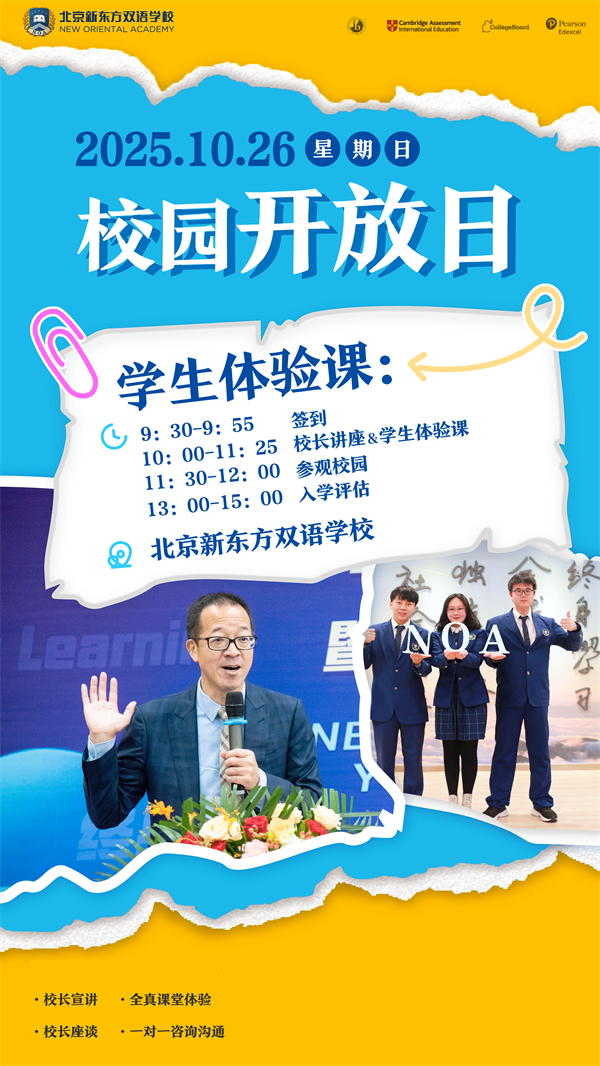 亲爱的家长们,北京新东方双语学校校园开放日将于 2025 年 10 月 26 日(星期日)举办!此次开放日安排了丰富活动,为您和孩子全方位展示学校风貌与教育特色。