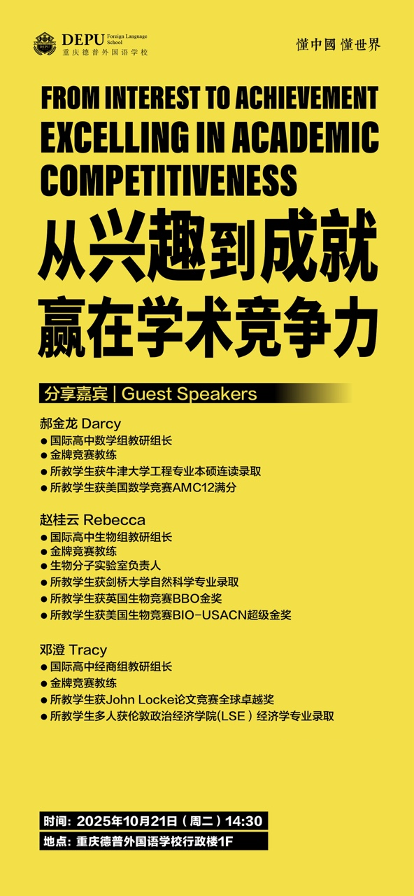 亲爱的家长们,重庆德普外国语学校以 “从兴趣到成就 赢在学术竞争力” 为主题的分享会,将于 2025 年 10 月 21 日(周二)14:30在学校行政楼 1F 举办。此次分享会邀请了多位优秀教师,为大家带来关于学术竞争力培养的精彩分享。