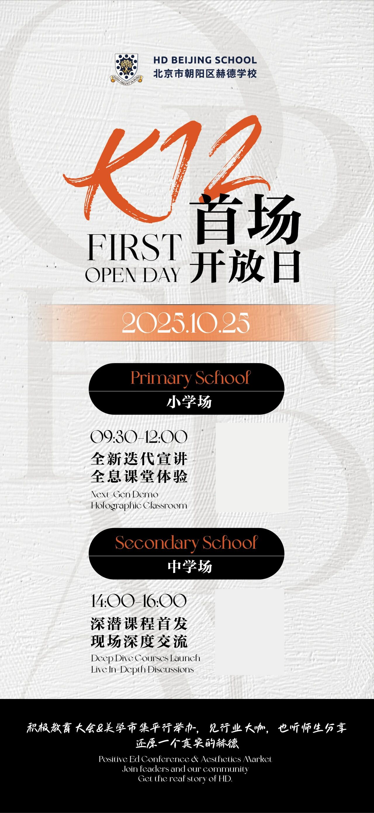亲爱的家长们,北京市朝阳区赫德学校 K12 开放日将于2025 年 10 月 25 日盛大开启!本次开放日分小学场与中学场,同步举办积极教育大会 & 美学市集,带您全方位感受赫德教育的独特魅力。