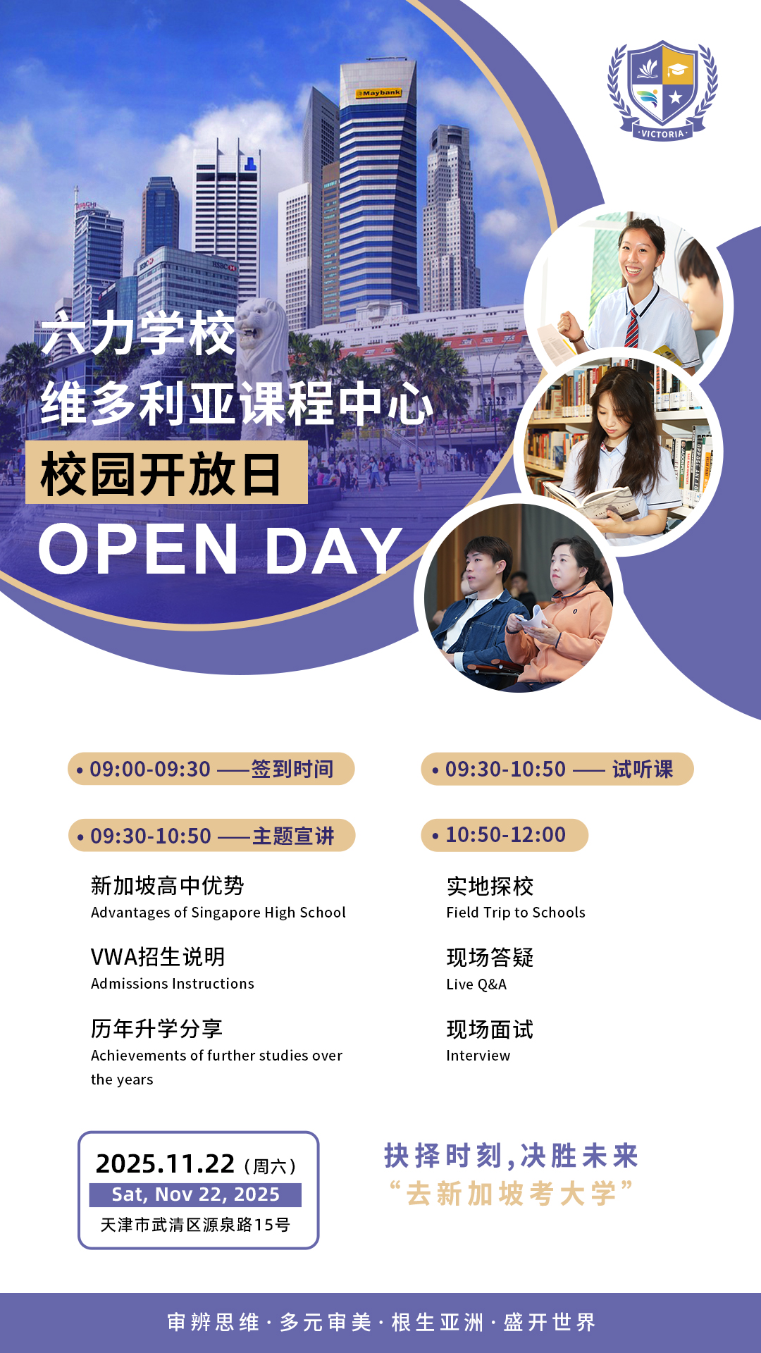 亲爱的家长们,六力学校维多利亚课程中心校园开放日将于2025 年 11 月 22 日(周六)举办,诚邀您与孩子一同走进校园,全方位了解新加坡升学优势与课程特色。