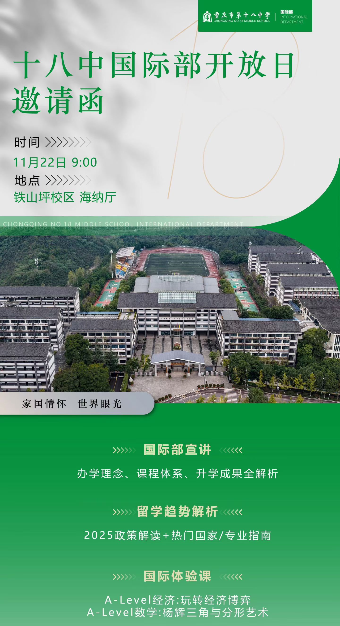 亲爱的家长们,重庆市第十八中学国际部开放日将于11 月 22 日 9:00在铁山坪校区海纳厅举办,诚邀您与孩子一同走进校园,深度了解国际部办学特色与升学规划。