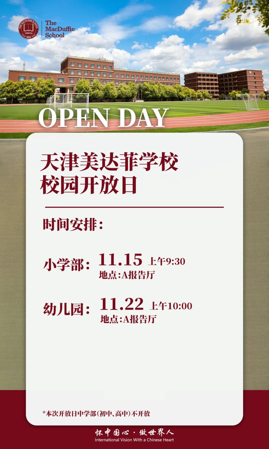 亲爱的家长们,天津美达菲学校校园开放日将分学段举办,诚邀您与孩子一同走进校园,深度感受学校的教育特色。
