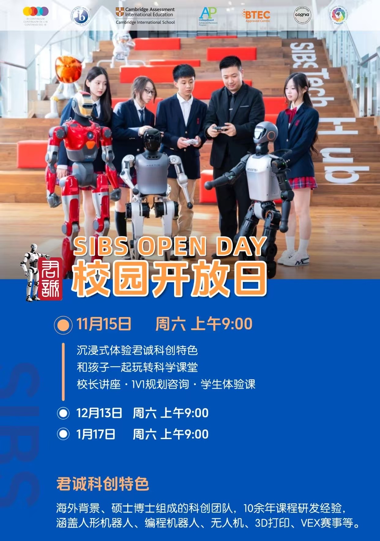 亲爱的家长们,SIBS 君诚校园开放日系列活动即将开启,多场活动诚邀您与孩子一同走进校园,沉浸式感受科创特色教育的魅力。