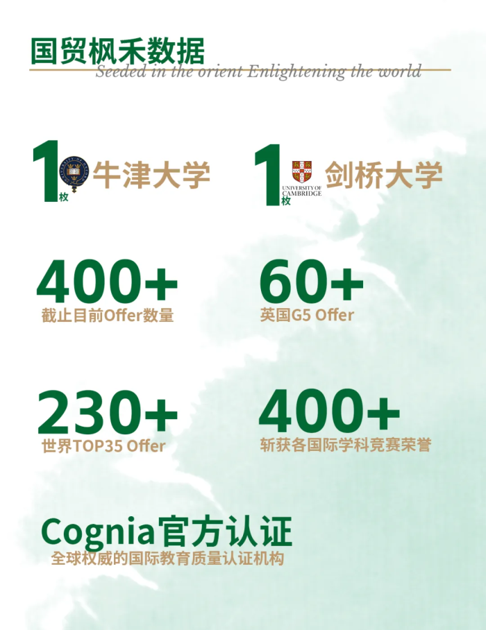 枫禾6届毕业生90%收获世界TOP35大学offer,超四成毕业生斩获英国G5大学offer。截至目前,学校已斩获offer数量400+,英国G5高校offer数量60+,世界Top35高校offer数量200+,其中就包括1枚牛津大学和1枚剑桥大学offer。
