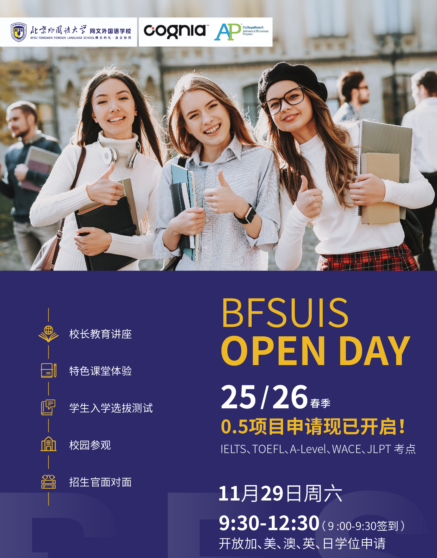 亲爱的家长们,北京外国语大学同文外国语学校(BFSUIS)校园开放日将于11 月 29 日(周六)9:30-12:30(9:00-9:30 签到)举办,诚邀您与孩子一同走进校园,了解多元国际升学路径与特色课程。