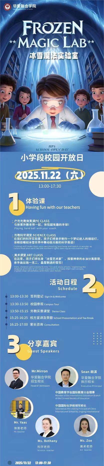 亲爱的家长们,华爱融合学院小学段校园开放日将于2025 年 11 月 22 日(周六)13:00-17:30举办,诚邀您与孩子一同走进 “冰雪魔法实验室(FROZEN MAGIC LAB)”,沉浸式感受科创与艺术融合的特色教育。
