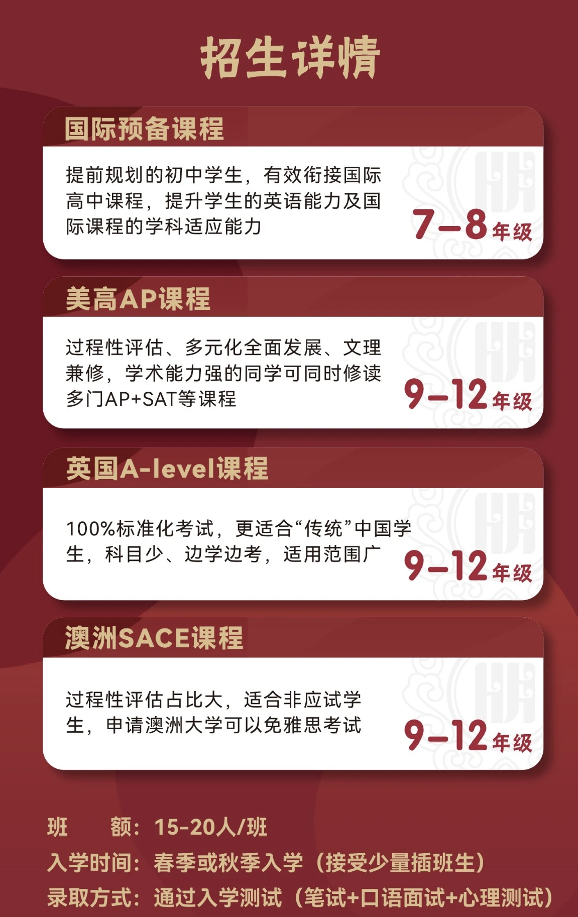 青岛为明学校国际部开设美高、英高和澳高课程,是美国索斯兰学校青岛校区、牛津国际AQA考试局官方授权的教学和考试中心(中心号码:96225)及南澳高考局授权SACE澳高课程中心,美国大学理事会CollegeBoard官方认证的AP学校(CEEBCode:694540)。学生入学即注册海外高中学籍,中外教管理团队及中外方双班主任管理模式,小班走班制授课,1:5师生比能更好地关注到每一个学生的成长。定制化的申请指导,学术成绩获海外大学高度认可,同时青岛为明学校国际部也是近百个国际学术竞赛的官方指定考点。