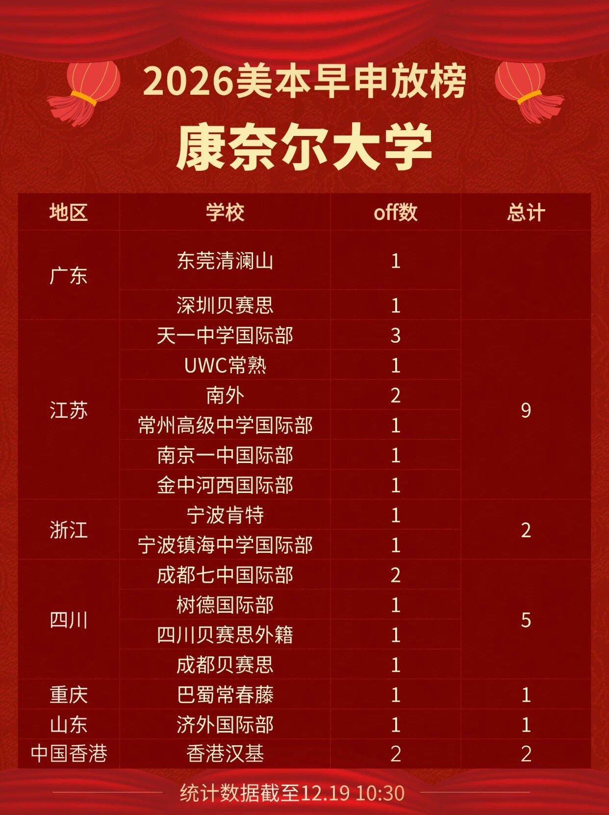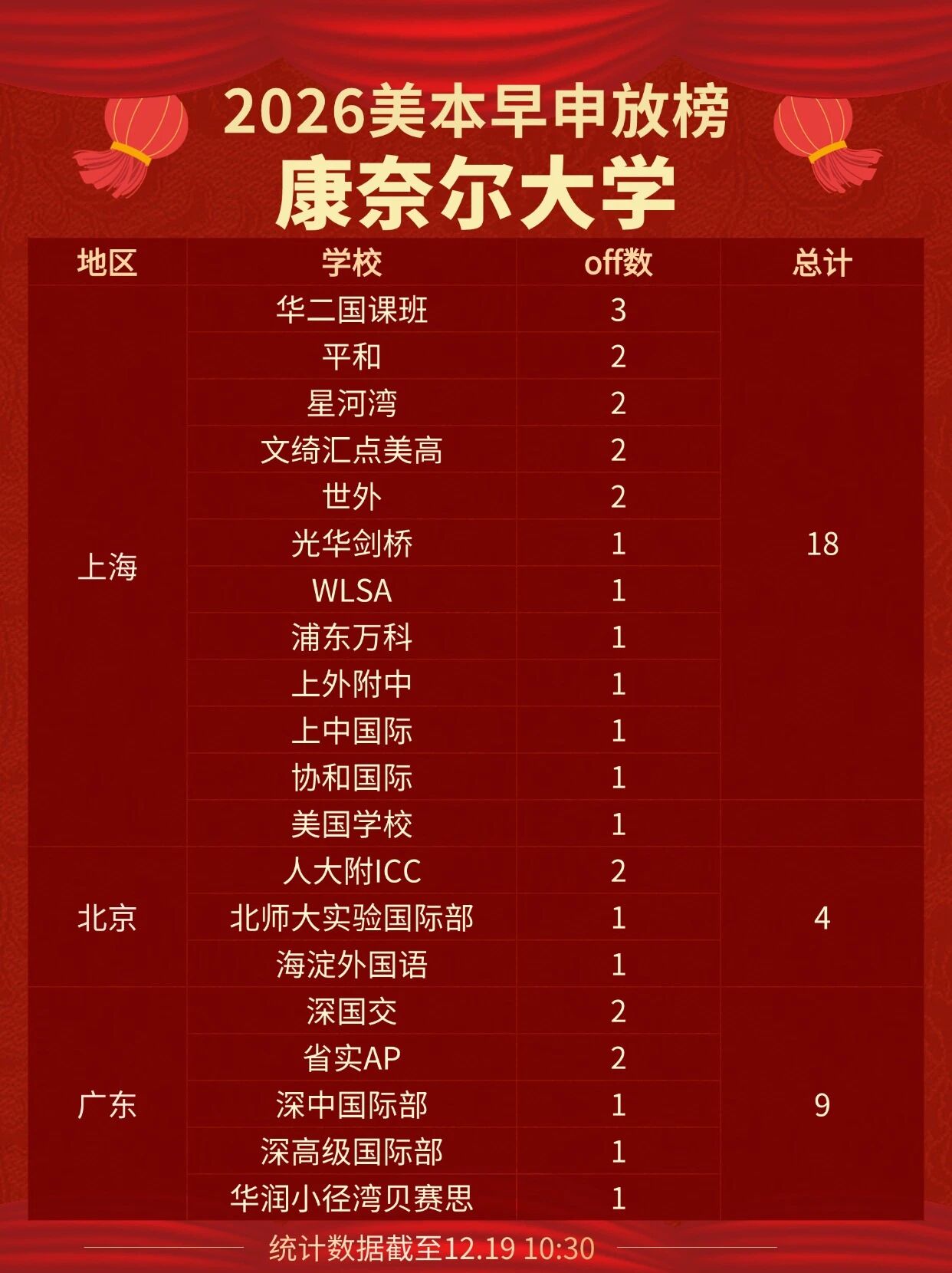 ✅康奈尔大学作为对中国学生极为友好藤校,目前国内学生已斩获51枚offer,上海以18枚暂列第一、广东9枚、江苏各9枚......