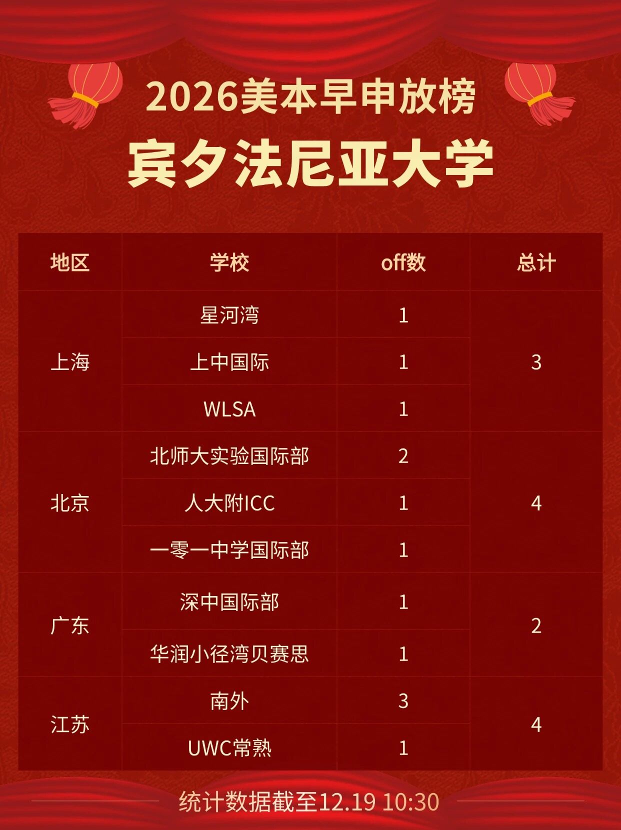✅宾夕法尼亚大学向中国大陆学生发放了13枚offer,北京、江苏各4枚、上海3枚,广东2枚;