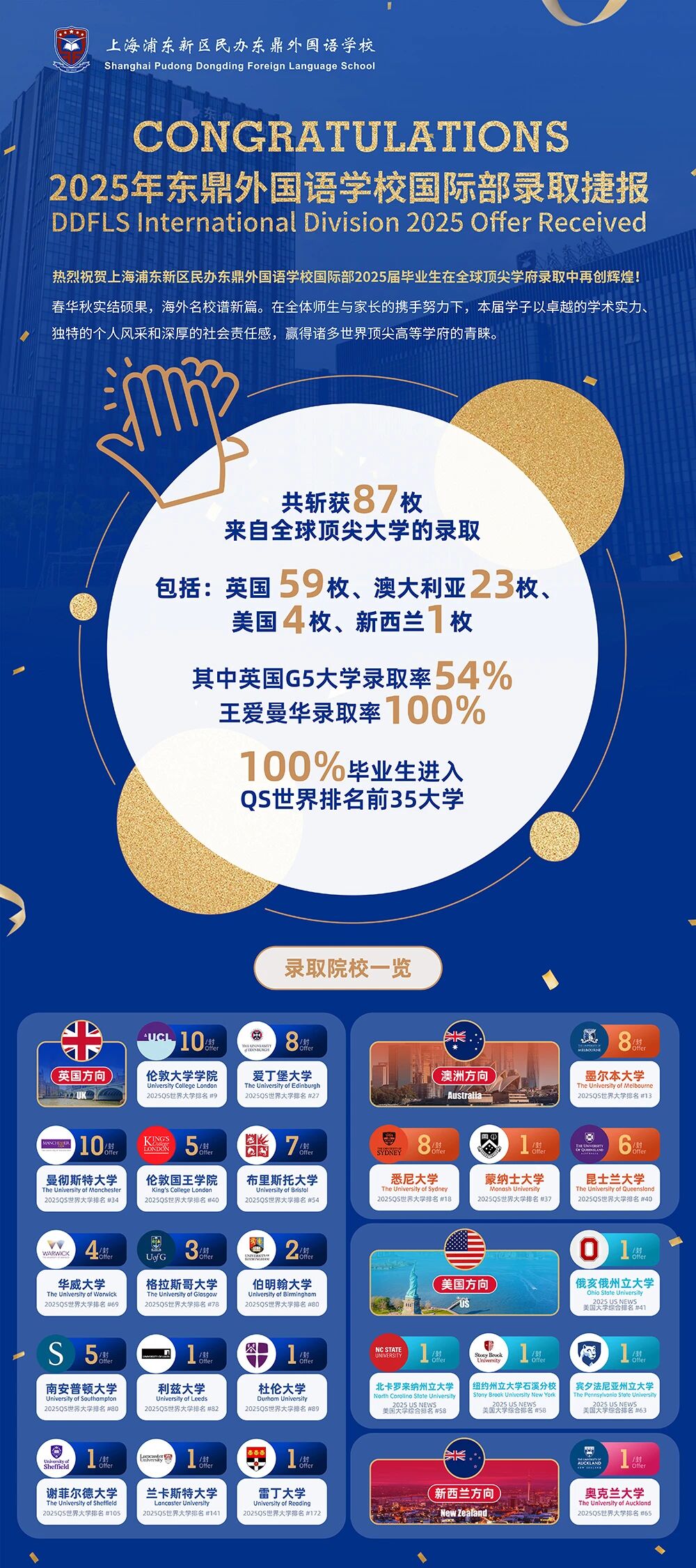 2025届毕业生共斩获87枚来自全球大学的录取。包括:英国 59枚、澳大利亚23枚、美国4枚、新西兰1枚。