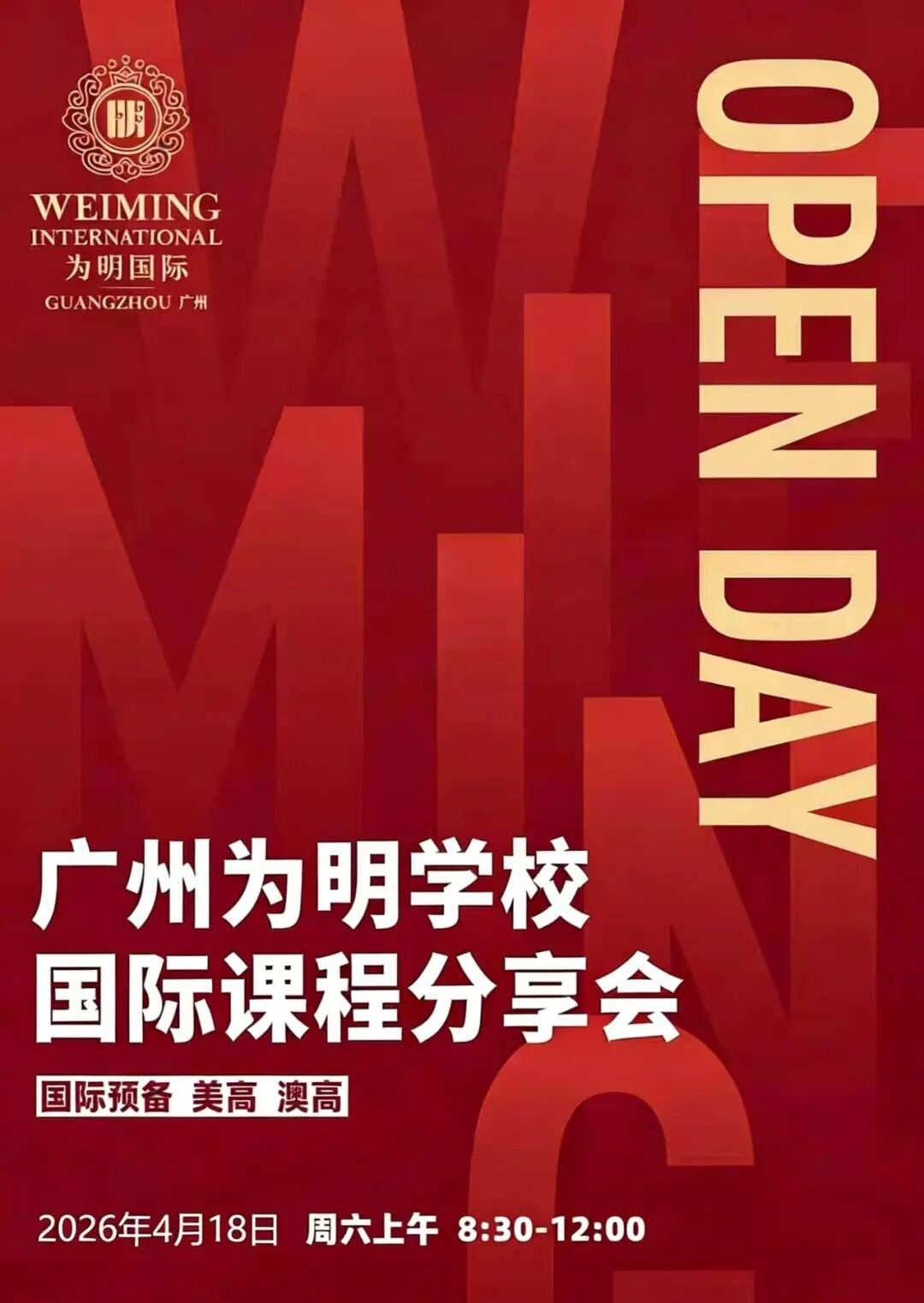 广州为明学校(为明国际・广州)将于2026 年 4 月 18 日(周六)上午 8:30-12:00,举办国际课程分享会暨校园开放日活动,面向有意向规划国际升学的学生及家长开放,邀请家庭走进校园,了解学校国际课程体系与升学方向。
