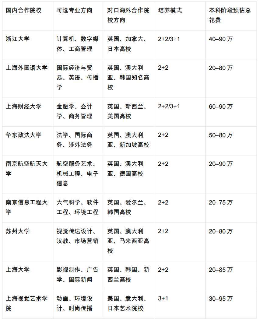 国内高校完成前面 2–3 年基础课程,海外大学 1–2 年完成专业课程,
