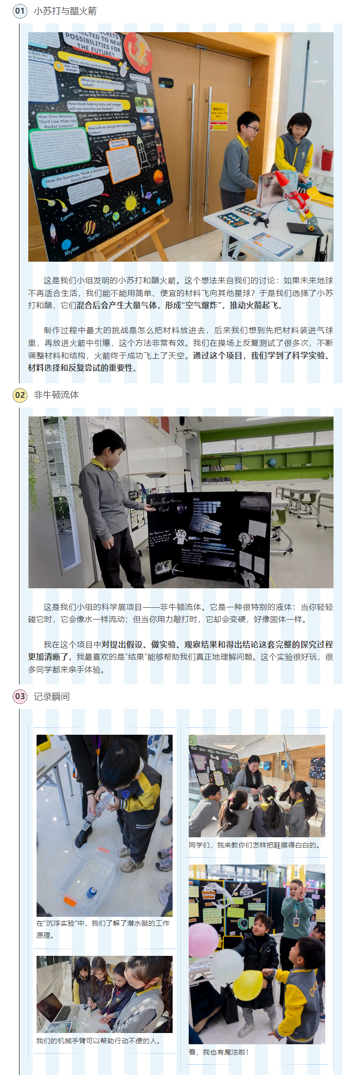 对小学阶段的学生来说,这并不容易。但正是在这样的表达过程中,科学思维开始成形。孩子们能够用英语完整讲述实验逻辑,清楚区分假设、过程与结论,清晰地呈现出在学术与表达能力上的进阶式进步。