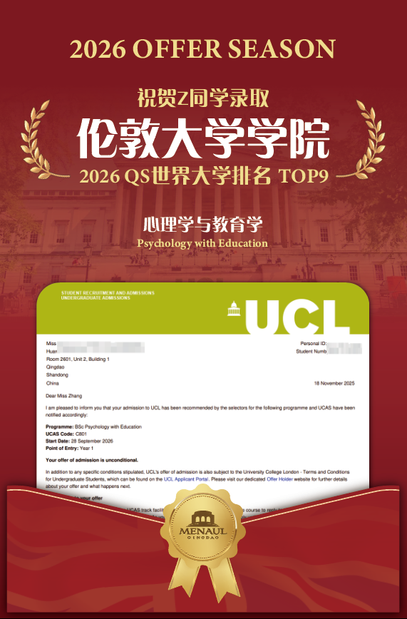 作为英国高校联盟成员,UCL学术实力与科研影响力享誉全球。而Z同学所录取的"心理学与教育学"专业,更是集两大学科优势于一身的黄金专业。