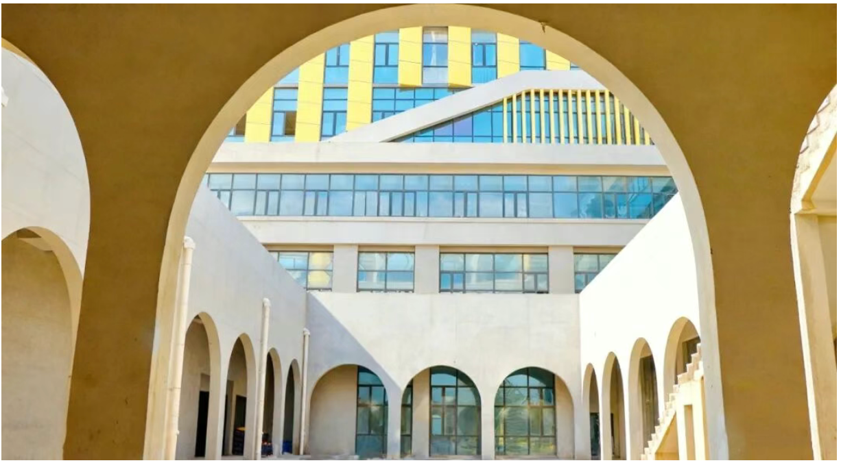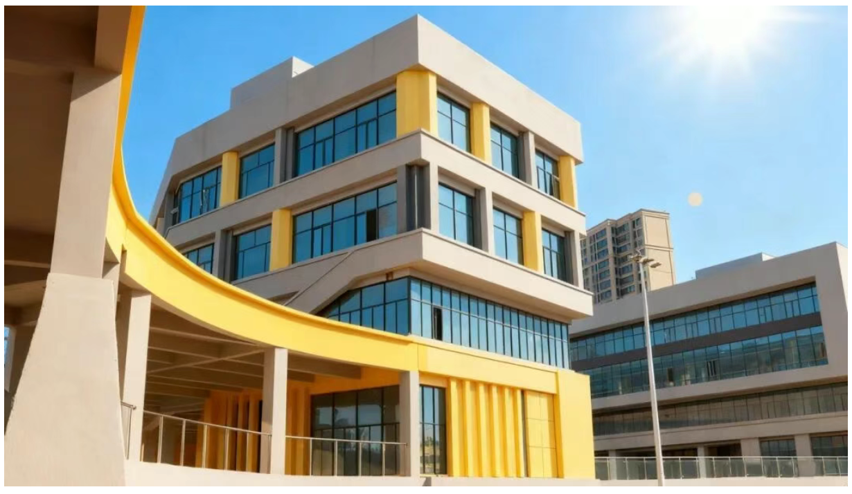 当明黄色的教学楼在蓝海与绿茵间舒展