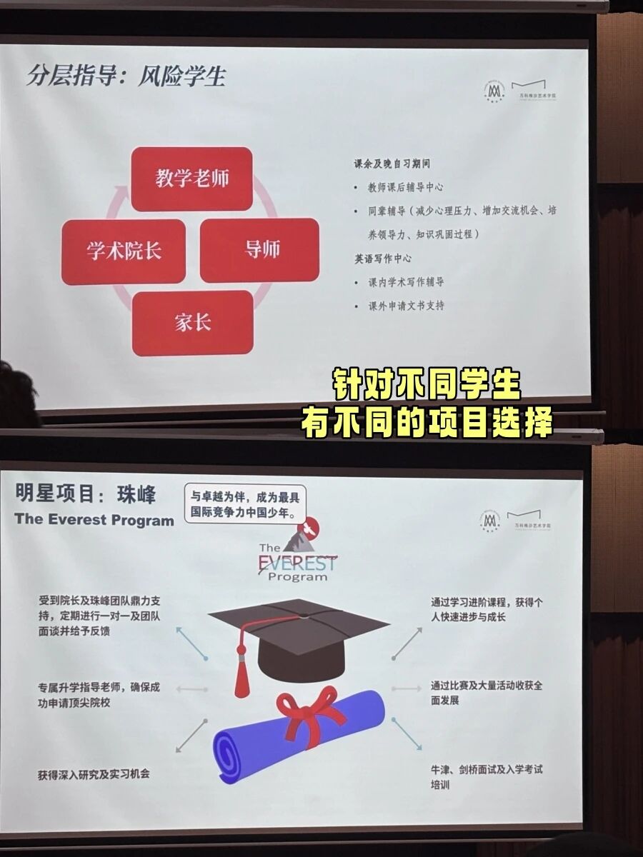 中美、中英、万科艺术学院三大课程体系“并驾齐驱”,每个课程方向的学生不拘泥于课程体系的限制,可以实现全球联申。艺术生也可以申请综合性大学(已有众多案例,打消家长顾虑)。