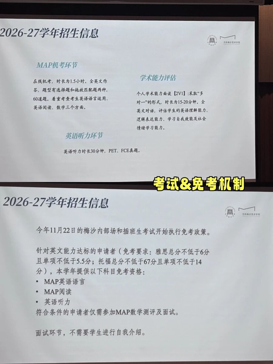 招生考试变化:去掉写作,改为听力,仍然使用MAP考察英语和数学能力。简化面试流程,改由考官直接发问,对学生综合素质进行全面考察。
