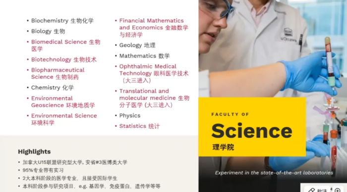 理学院本科阶段就有与医学相关、且对国际学生开放申请的专业:眼科医学技术与生物分子医学。