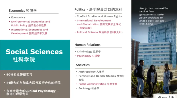社科学院是全加拿大与联邦政府合作规模大的学院,拥有全加数一数二的政治科学、国际发展和全球化专业,以及加拿大的临床心理学专业。
