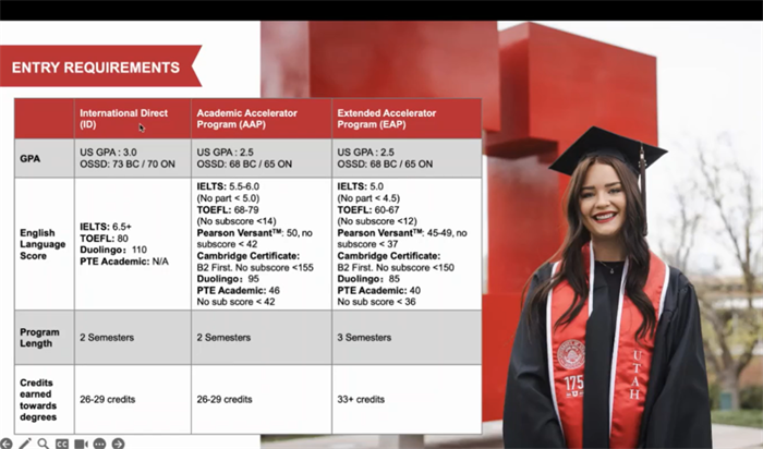 根据专业不同,OSSD均分要求在70-90+,且部分专业有前置课程要求;雅思6.5(写作小分6.5)即可直 录,语言不达标学生可根据情况选择语言班双录取/语言课(正常开学但加修语言课作为辅修)。