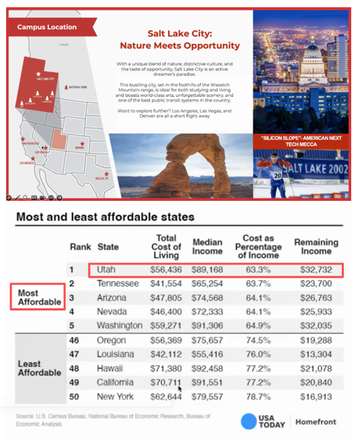 学校坐落在一个快速发展且宜居的城市——犹他州首府盐湖城,该州凭借“经济和就业市场发展”第一、“全美生活幸福指数”第二,被称为全美第一洲。