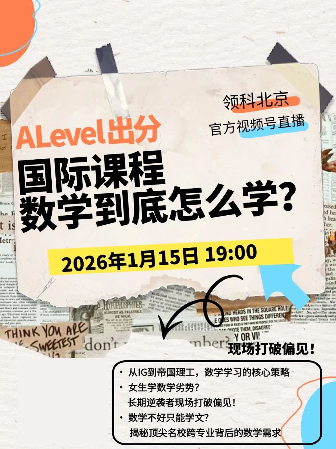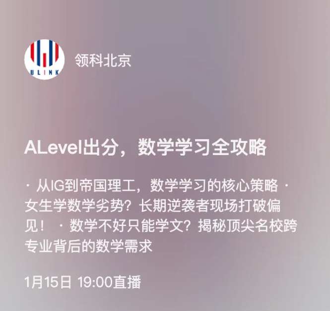 本周四晚上,领科北京官方视频号直播,专门来聊一聊:在国际教育的轨道上,数学这门“核心学科”,到底应该如何高效学习,冲刺A*?