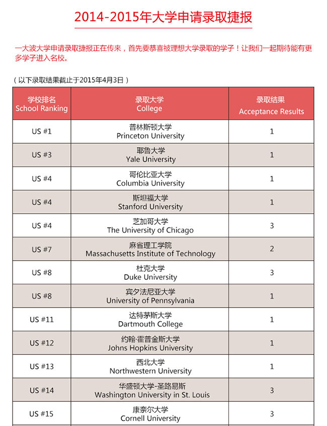 2014年的学生录取结果非常出色,31%的学生被常青藤学校录取,比去年22%的比例还要高出许多。常春藤学校的平均录取率仅为8%,而我们的学生的录取率几乎是这个数字的4倍。我们的学生中,77%得到了他们较希望被录取的前3所学校的录取通知,这至少是美国私立高中学生录取结果的2倍。我们去年为200个以上的申请提供了服务。