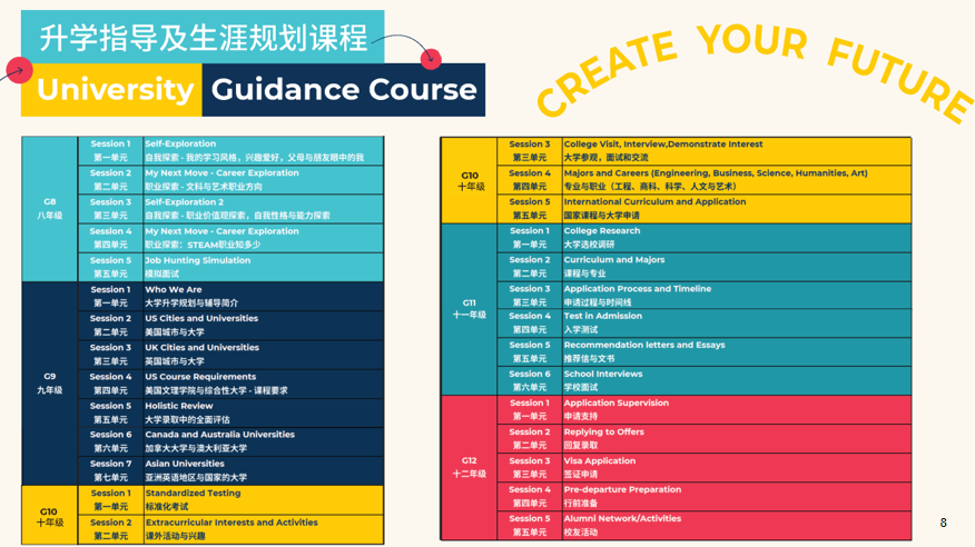 学校提供长达六年的升学指导及生涯规划。帮助学生更好地发现自己、思考人生方向,树立学习目标,结合专业的第三方学术、语言及职业测评、背景提升、标化支持等帮助,为学生专业及职业的选择、大学申请做好充足的准备。
