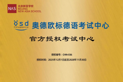 重磅喜讯!北京市朝阳区新亚学校再获国际语言考试官方授权,成功成为德语ÖSD(奥德欧标)官方考试中心!这是学校在多语种教育领域深耕多年的又一重要成果,将为本校德语学子带来更优质、更便捷的语言考核资源,助力大家在国际化发展道路上稳步前行!