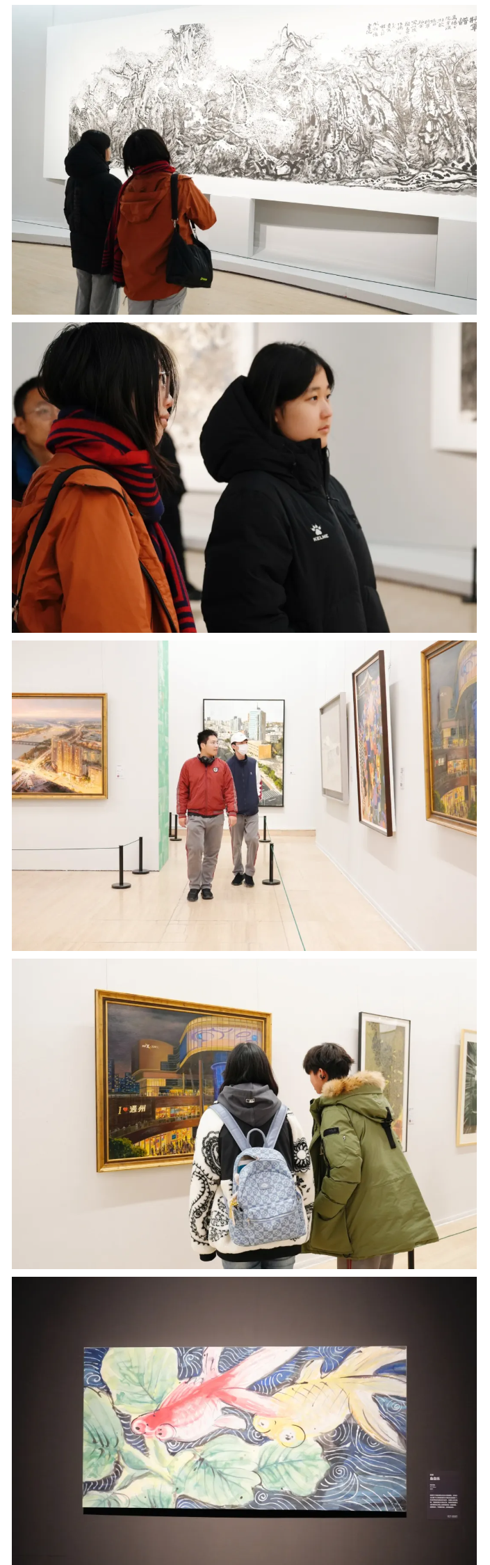 大家或驻足凝视、细细品味,或轻声交流、分享感悟,在视觉与思想的双重触动中,主动积累艺术知识,锻炼观察分析能力。同时,老师结合展品特点适时解读创作背景与艺术价值,引导同学们从构图、色彩、技法等维度深度赏析,让每一次停留都成为一次有收获的审美体验。