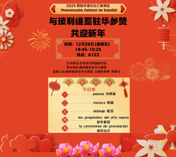 此次活动恰逢岁末迎新之际,不仅为西语学子提供了展示学习成果的平台,更让大家在近距离接触外交使者、感受异域文化的同时,将新年的期许融入西语学习的热忱之中,加深了对这门语言的热爱与探索欲。新的一年,本校将继续搭建多元文化交流平台,助力学子以语言为翼,拓宽国际视野,在跨文化交流的舞台上书写更多成长与精彩!