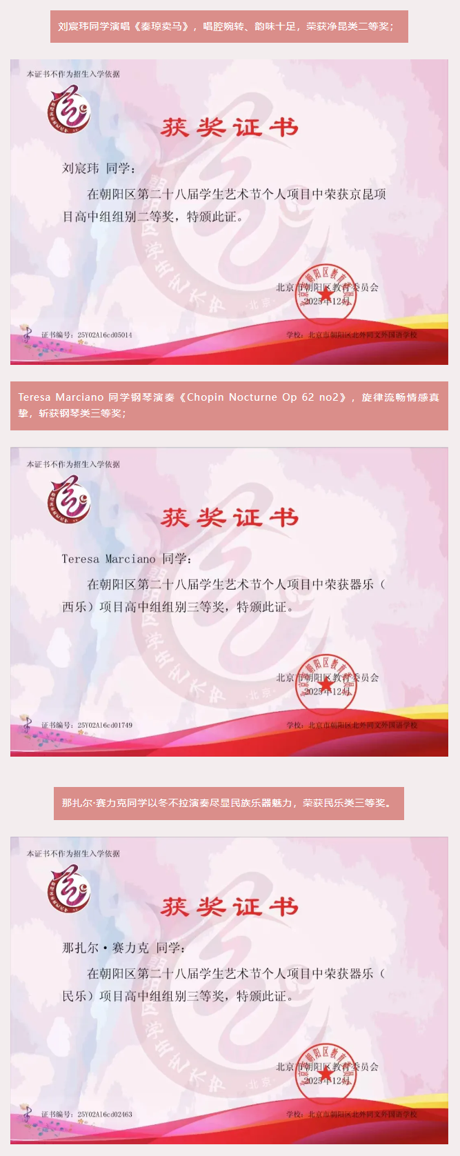 近日,在北京市朝阳区第二十八届艺术节个人项目展演中,本校学子凭借扎实的专业功底与出色的舞台表现斩获佳绩,荣获净昆类、钢琴类、民乐类多个奖项。