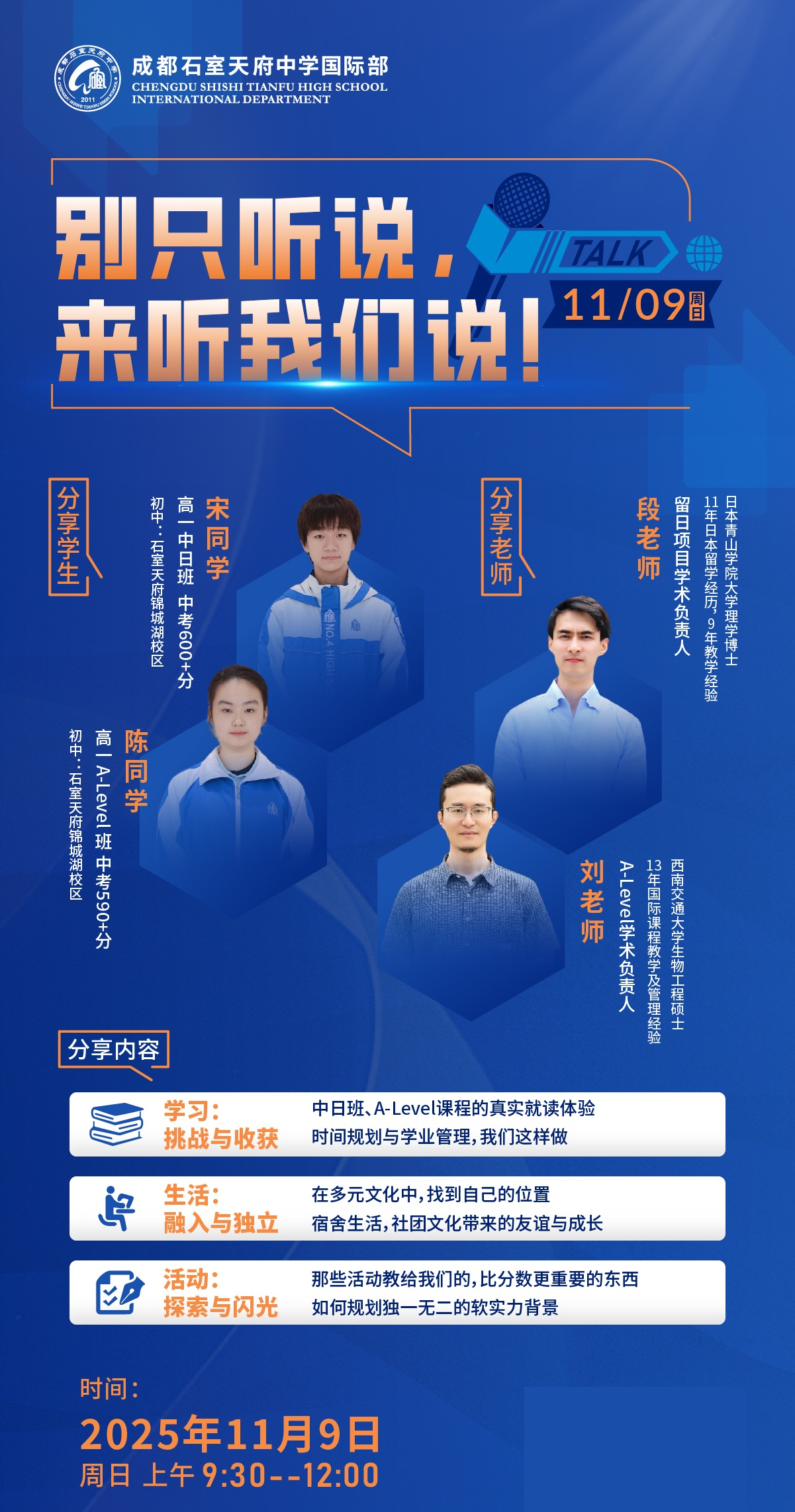 亲爱的家长们,成都石室天府中学国际部将于2025 年 11 月 9 日(周日)上午 9:30-12:00举办主题分享会,诚邀您与孩子一同参与,深度了解中日班、A-Level 课程的真实就读体验与升学规划。