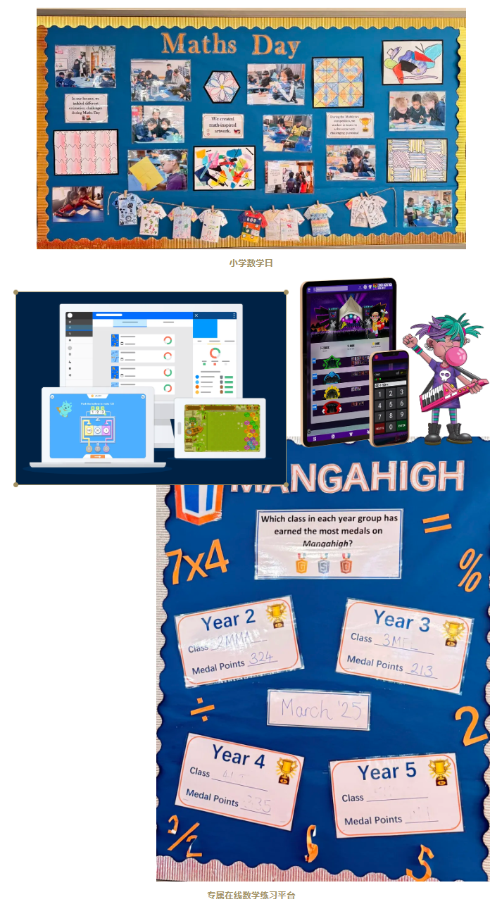 英文数学的成绩与中文数学分开评估与报告,使家长能够清晰地看到孩子在两种数学体系中的独立发展状况。学校还通过小学数学日、课堂突出表现奖、学业突出表现奖等多元奖励以及家校沟通机制,让孩子在积极的氛围中享受数学带来的成就感;课外,学校还为本校学生和家长配套了专属的在线数学练习平台,以闯关和挑战的形式设计任务,引导孩子在家中持续用英文完成每日打卡,在一点一滴的坚持中,既巩固运算与思维能力,也逐步养成自我管理和自律学习的好习惯。