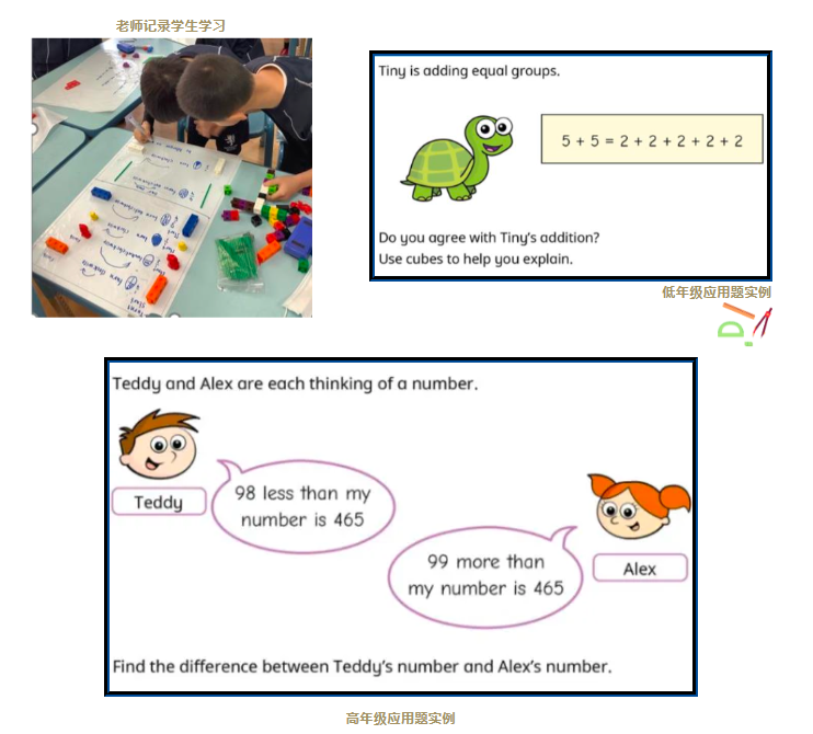 课堂形式上,英文数学侧重“全班教学+同伴对话”的组合。教师会精心设计每一节课,以满足所有学生的学习需要,并且不为任何一个孩子设定上限,通过层层递进的提问不断把学生引向更高层次的思考,再借助“同桌伙伴讨论”等环节,让孩子在用英语讲解自己思路的过程中进一步澄清概念。