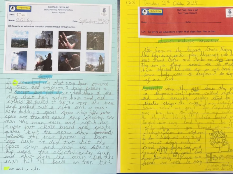 哈罗北京采用的是在英国本土广泛应用的 Talk for Writing 教学法。简单来说,这是一种从“会说”走向“会写”的路径:先让孩子通过“说”和“演”把语言结构内化,再引导他们落到纸面,形成自己的作品。每一个单元都会从一项 Cold Task (冷任务)开始——在正式教学前,请孩子先尝试写一篇文章,老师据此判断孩子目前的水平,精准设计接下来的教学重点。