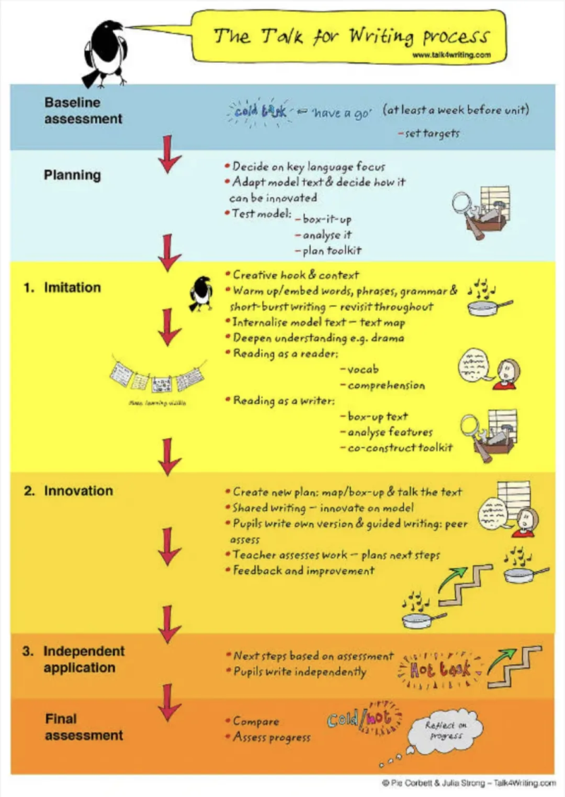 在随后的“模仿阶段”里,老师会用一个极具吸引力的创意情境把孩子们带入文本:可能是一段戏剧表演,一张故事地图,或者一场沉浸式的课堂活动。孩子们通过齐声朗读、角色扮演、口头复述等方式,将故事的结构、句式、表达方式真正记在脑中、说在嘴里。接着进入“创新阶段”,老师一边示范写作,一边与孩子共同修改句子、调整结构,穿插短时写作训练,让他们学会如何在一篇文章里运用新的词汇和语言工具。最后的“独 创阶段”,孩子们要在示范文本的基础上,自主修改、扩展甚至完全改变情节,写出属于自己的故事。