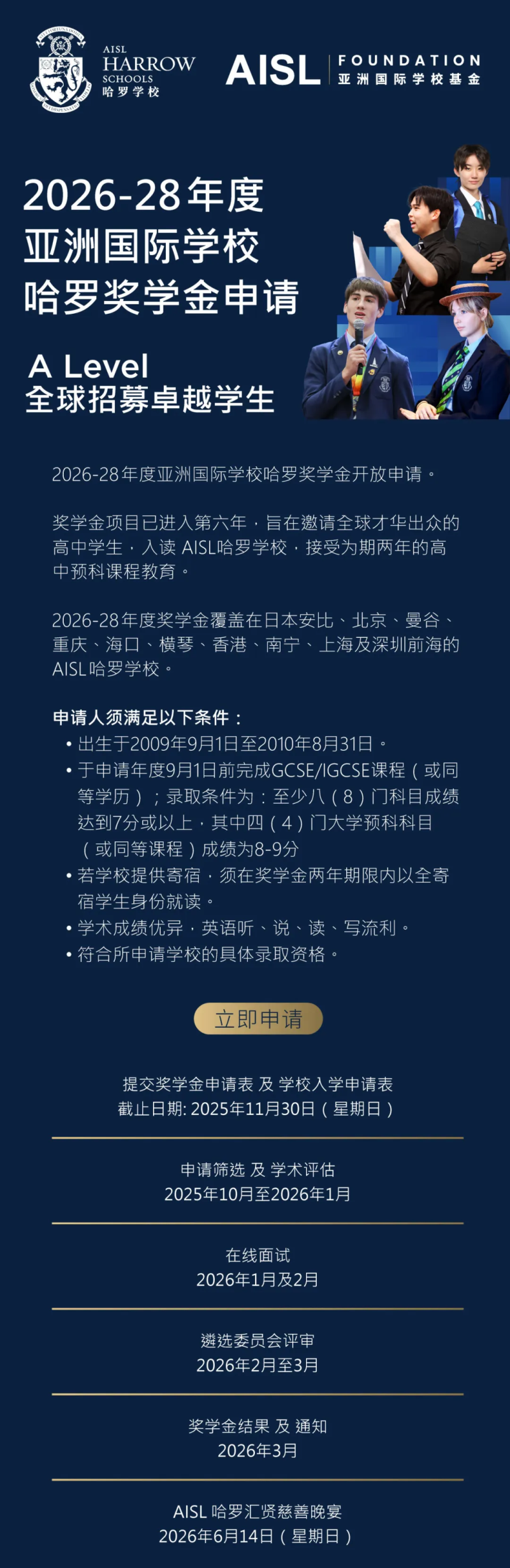 中学阶段获AISL哈罗全额奖学金入读哈罗北京