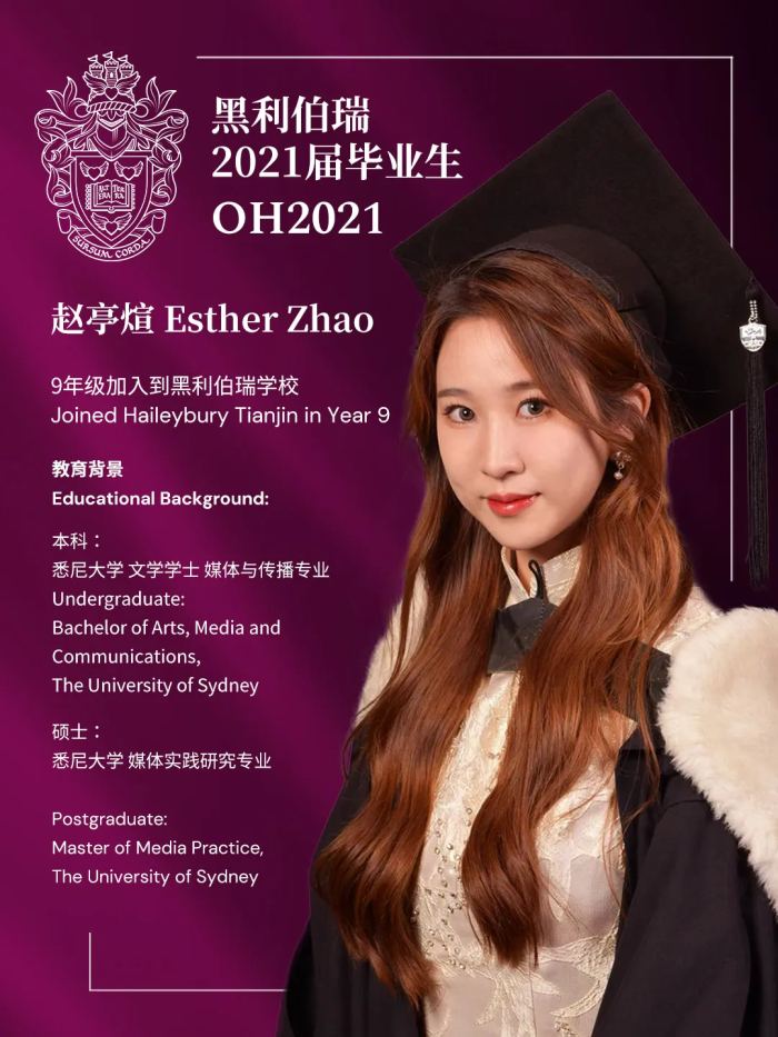 在国际化教育的浪潮中,一所学校的成功,最终由她所培养的学子来定义。他们的视野、能力与格局,是对母校教育最有力的背书。天津黑利伯瑞学校2021届毕业生赵亭煊 Esther的成长轨迹,便是这一理念的生动诠释。从黑利伯瑞起步,到即将从悉尼大学媒体实践专业硕士毕业并已在澳洲任职,她的故事,印证了黑利伯瑞教育模式的深远奠基与前瞻远见!