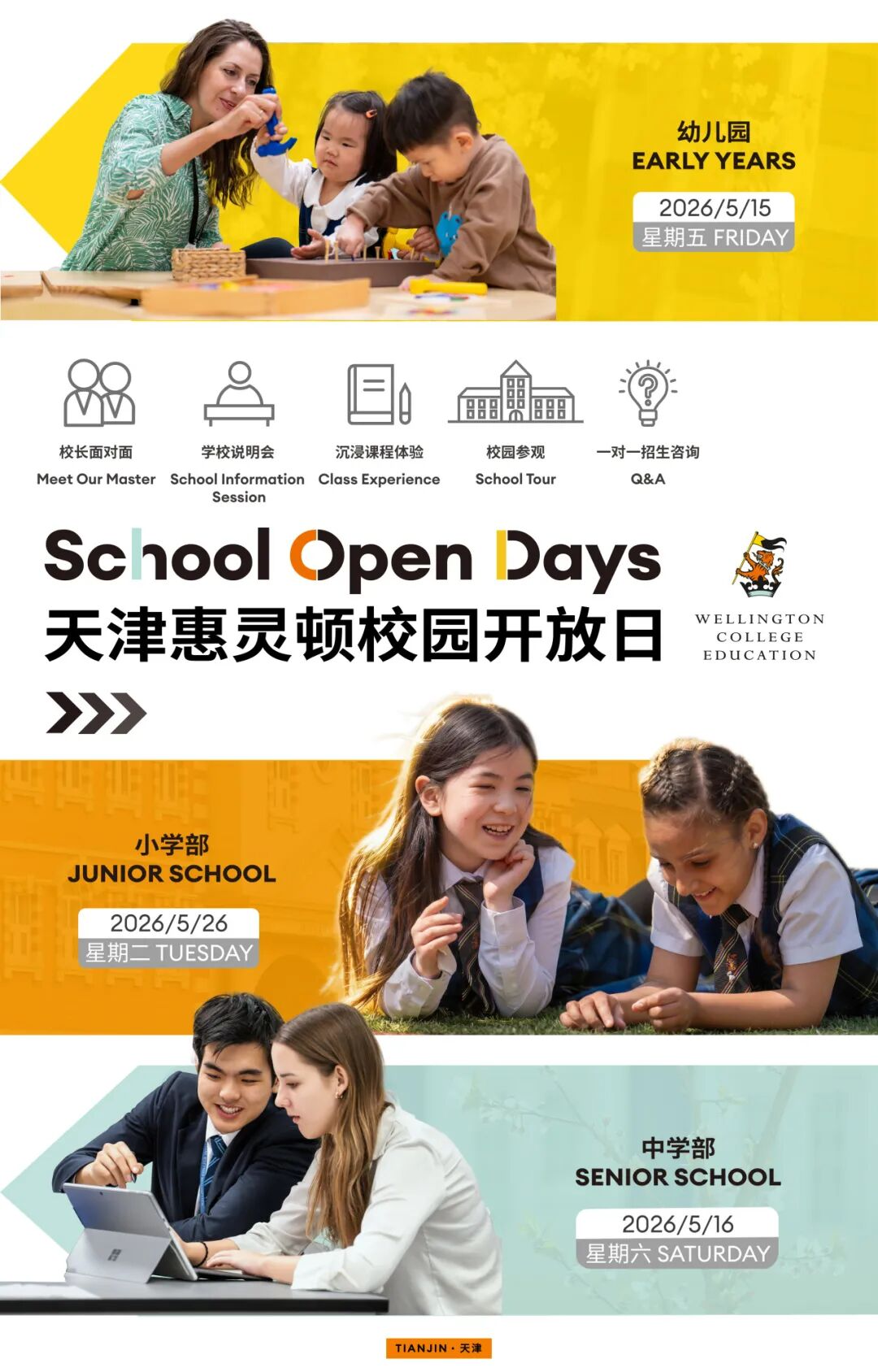 惠灵顿(中国)教育集团天津校区五月校园开放日预约通道现已开启。面向2025–26学年及之后入学的学生和家长,我们精心准备了校园深度体验之旅,让您零距离感受面向2至18岁学子的国际化教育理念,在真实的课堂与环境中,预见孩子成长的无限可能。