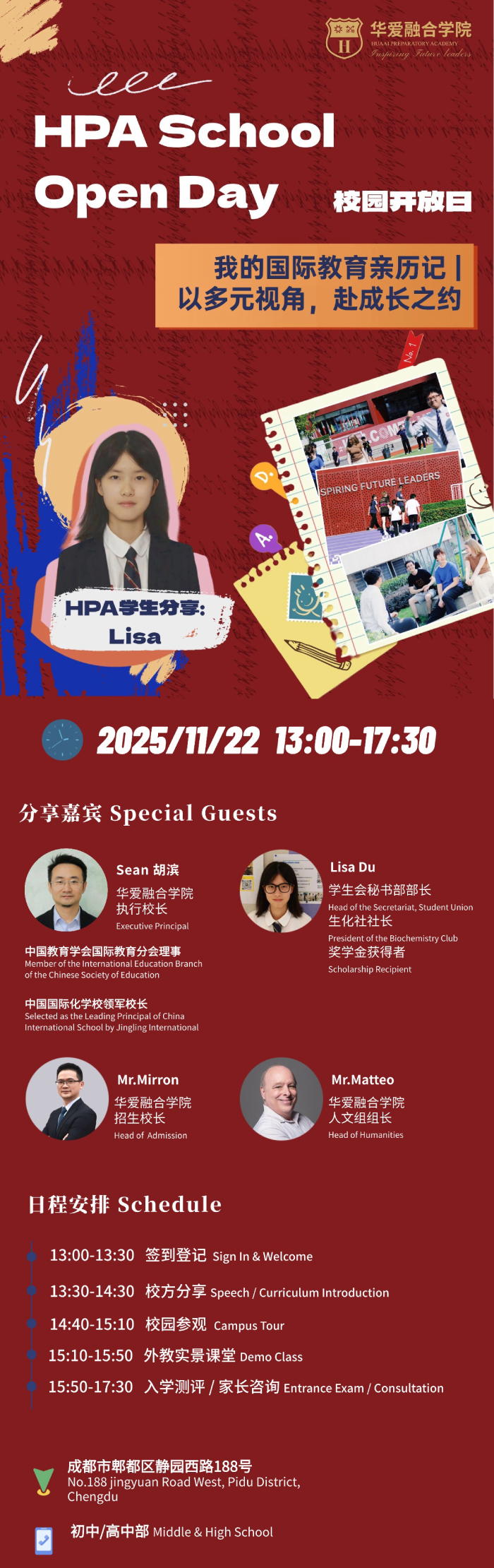 亲爱的家长们,HPA School 校园开放日将于2025 年 11 月 22 日 13:00-17:30举办,诚邀您与孩子一同走进校园,聆听 “我的国际教育亲历记”,以多元视角共赴成长之约。