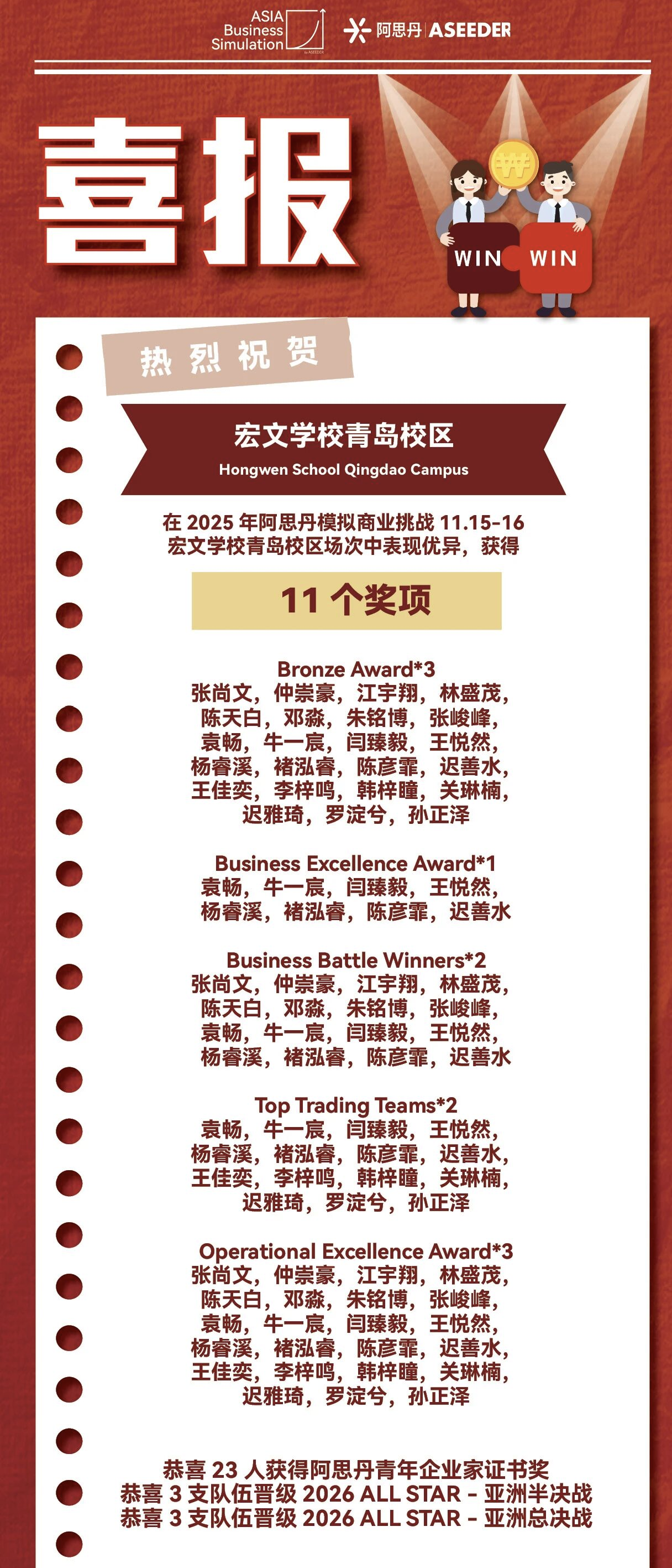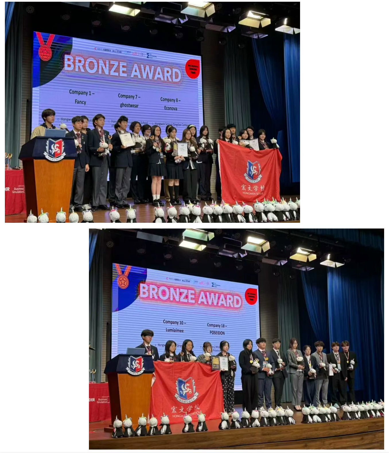 今年,来自上海、北京、青岛、淄博、威海等地的18支代表队济济一堂,宏文学校青岛校区三支由G1与Pre-A年级新生为主体的队伍,从一众大赛经验和知识储备强劲的对手中脱颖而出,一举夺得区域赛铜奖。与此同时,宏文小将们还收获了Business Excellence Award、Business Battle Winners、Top Trading Teams、Operational Excellence Award等多个单项奖,并成功晋级全国总决赛。