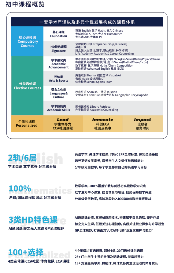 此外,学生通过选修课后课(ECA)或选拔进入校队,继续专业精进;并在中学阶段,选择艺体升学项目进行大学申请。确保孩子们能在艺术、体育的三级通路中,将兴趣和特长深度发展,自信蓬勃成长。