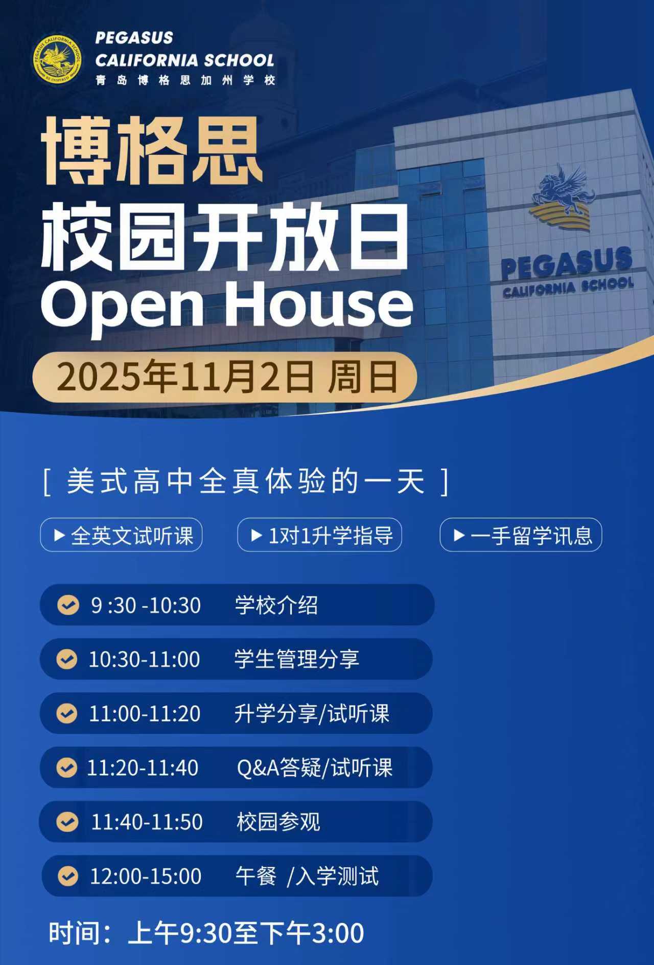 亲爱的学生及家长们,青岛博格思加州学校校园开放日将于2025 年 11 月 2 日(周日)上午 9:30 至下午 3:00盛大开启!本次开放日以 “美式高中全真体验的一天” 为主题,为您带来全英文试听课、1 对 1 升学指导及一手留学讯息,深度感受美式教育魅力。