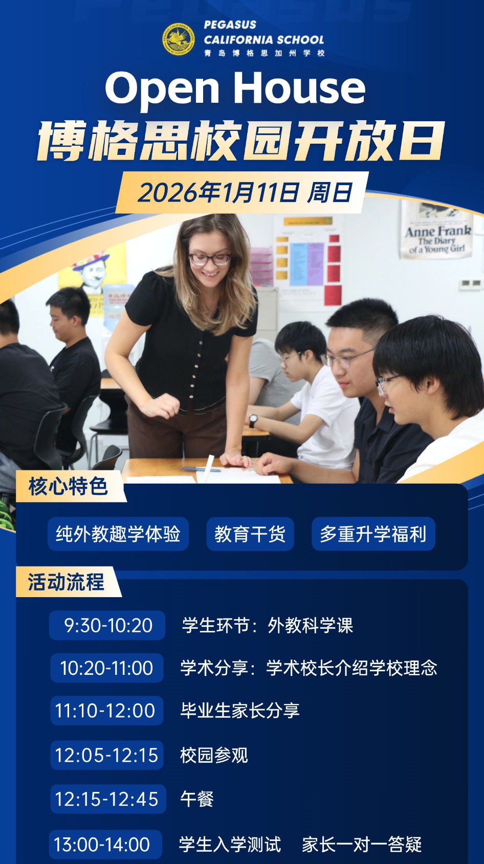 亲爱的家长们,青岛博格思加州学校(PEGASUS CALIFORNIA SCHOOL)校园开放日将于2026 年 1 月 11 日(周日)举办,诚邀您与孩子一同走进校园,沉浸式感受纯外教教学特色与多元升学规划。