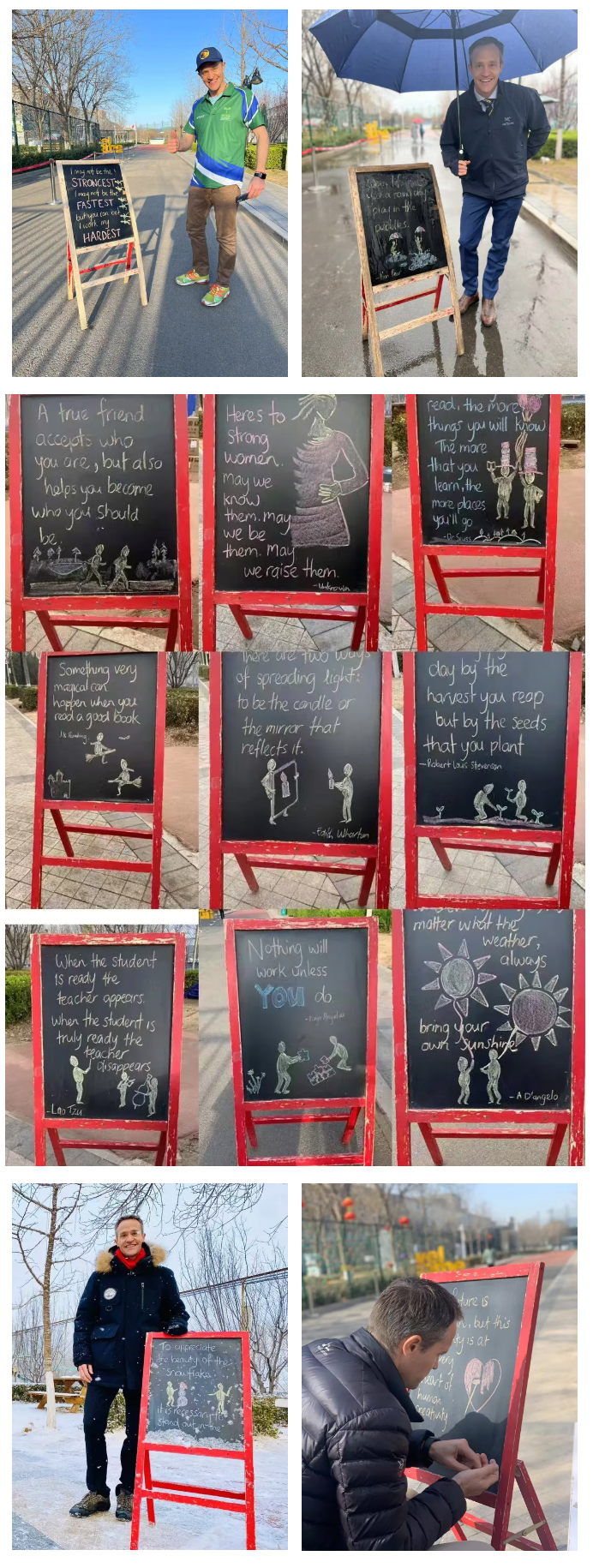 今早走进校园时,门口那块熟悉的校长小黑板又出现了。上面写着:“Education is the foundation on which we build our future!”一瞬间,许多老青苗人的记忆被唤醒——我们真正的创校校长Caleb Archer,回来了。