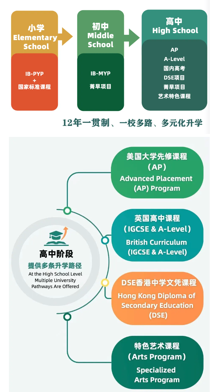 初中阶段课程以中国国家课程为基础,融合IB中学项目(MYP)框架,注重探究式与跨学科学习。课程设置包括语言文学、语言习得、数学、科学、人文、艺术、体育健康及设计技术八大学科组。高中阶段为学生提供AP、A - Level、DSE、特色艺术等多条升学路径。