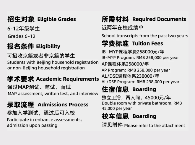 学校占地600余亩,环境优雅宁静,教学与生活设施先进完备。配备完善的现代化教育设施,涵盖智能化多媒体教室、物理/化学/生物实验室、STEAM创客空间、专业艺术教室与剧场、体育馆、足球场、篮球场、高尔夫球场、心理辅导室与学生支持中心、图书馆与学习资源中心等。学校宿舍环境温馨舒适,设有独立卫浴与学习空间。校车路线覆盖北京市主要区域,为学生提供安全便捷的出行保障。